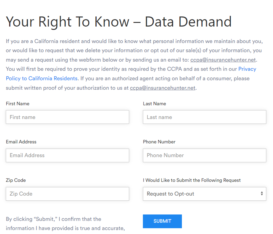 Описали возможность пользователя обратиться к Insurance Hunter, чтобы узнать какую информацию о нем хранит платформа, потребовать удалить или изменить личные данные. Внедрили форму для пользователей из Калифорнии