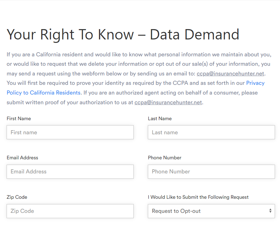 Lawyers described the user's ability to contact Insurance Hunter to find out what information the platform stores and to demand that personal data be deleted or changed. We implemented a form for California users