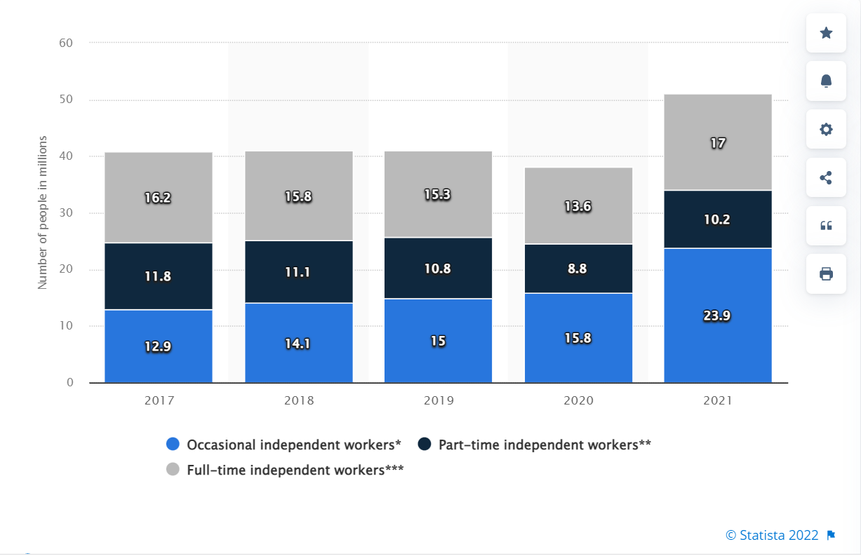 In 2027, 86.5 million people are projected to freelance in the United States, or 50.9% of the total workforce.