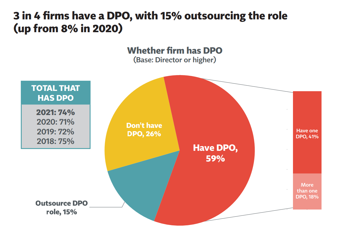The International Association of Privacy Professionals surveyed 65,000+ respondents worldwide and published a report on information security professionals. 74% of companies hired a Data Protection Officer in 2021. 41% of companies involved one information security officer in the team, 18% - had two or more, and another 15% preferred outsourcing.