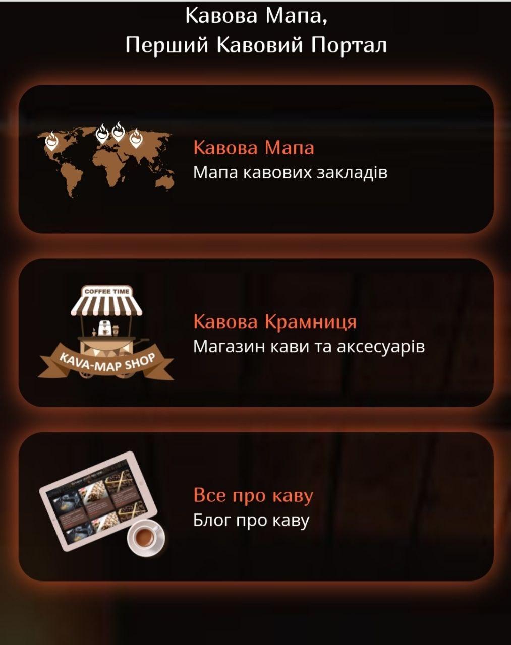 Kava-map об'єднує в одному IT-рішення поціновувачів кави та заклади, які продають і готують його. Так покупці приходять на майданчик, щоб купити кави або знайти заклад, а продавці, щоб внести кав'ярню на мапу і розмістити товар в інтернет-магазині.